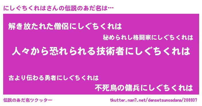 | 男性向けラノベタイトル風あだ名 | 『おまえをオタクにしてやるから、俺をにしぐちくれはにしてくれ! 』 |