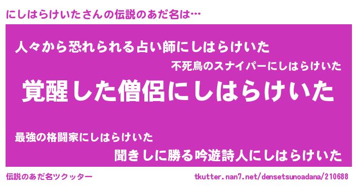 | ヘコむあだ名 | 『にしっぺ』『にしはらけいた(笑)』 |