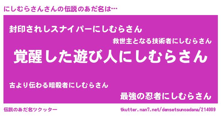| 意味不明あだ名 | 『住所不定無職にしむらさん(91歳)』 |