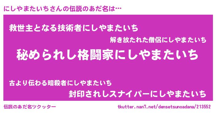 | 男性向けラノベタイトル風あだ名 | 『やはりにしやまたいちの青春ラブコメはまちがっている 』 |