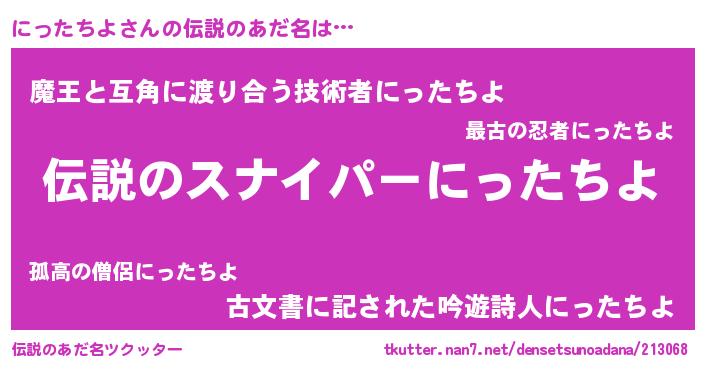 | 男性向けラノベタイトル風あだ名 | 『魔弾の王とにったちよ』 |