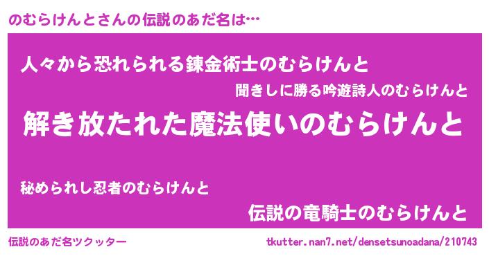 | 男性向けラノベタイトル風あだ名 | 『魔弾の王とのむらけんと』 |