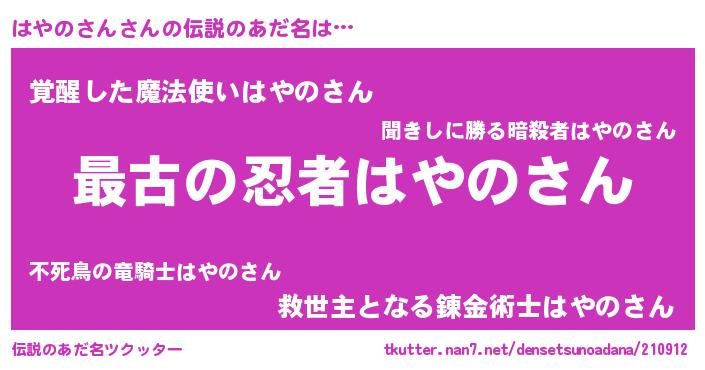 | 男性向けラノベタイトル風あだ名 | 『うちの娘の為ならば、俺はもしかしたらはやのさんも倒せるかもしれない。』 |