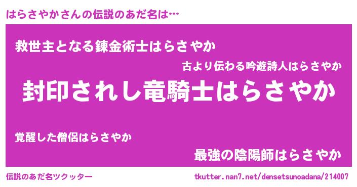 | ヒーロー風カッコイイあだ名 | 『スーパーハラサヤカ』『ネオハラサヤカ』 |