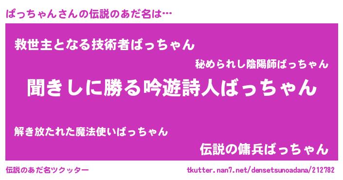 | 女子向けラノベタイトル風あだ名 | 『異世界で失敗しない100のばっちゃん』 |