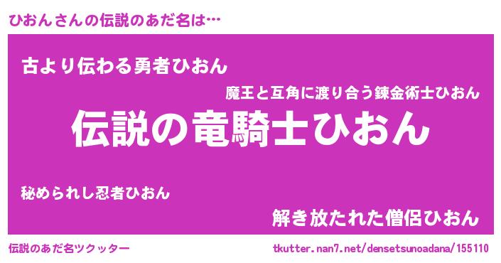 | 男性向けラノベタイトル風あだ名 | 『ひおんの憂鬱』『魔弾の王とひおん』 |