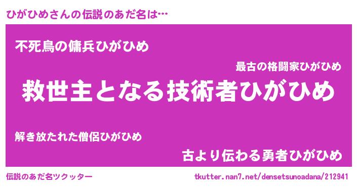 | 男性向けラノベタイトル風あだ名 | 『この素晴らしい世界にひがひめを!』 |