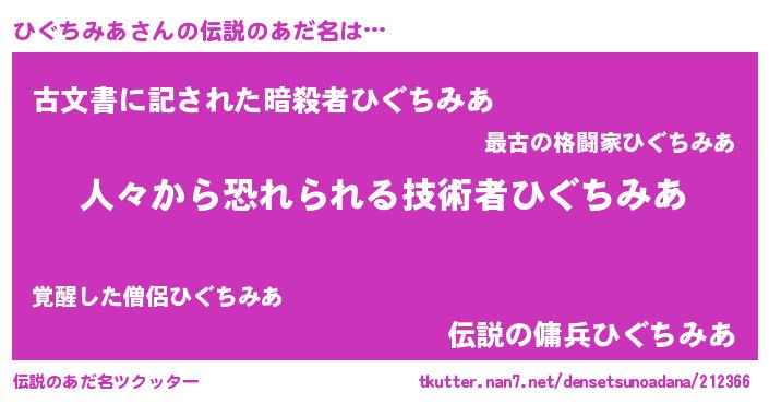 | ヘコむあだ名 | 『ひぐちみあ(笑)』『ひぐもー』 |