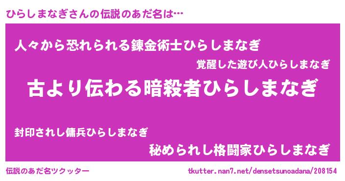 | 肩書あだ名 | 『ひらしまなぎ閣下』『ひらしまなぎ教官』 |