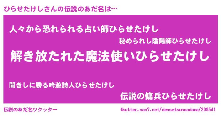 | ヒーロー風カッコイイあだ名 | 『魔戒騎士ヒラ』『スーパーヒラセタケシ』 |