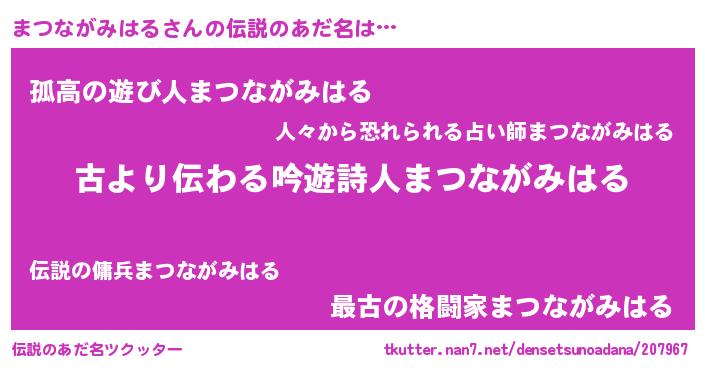 | ヘコむあだ名 | 『まつながみはる(小並感)』『まつぷりん』 |