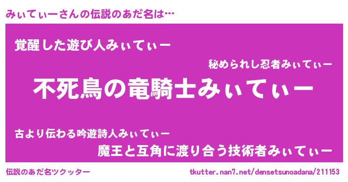 | 意味不明あだ名 | 『住所不定無職みぃてぃー(7歳)』 |