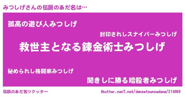 | 男性向けラノベタイトル風あだ名 | 『みつしげに滅ぼされるだけの簡単なお仕事です』 |