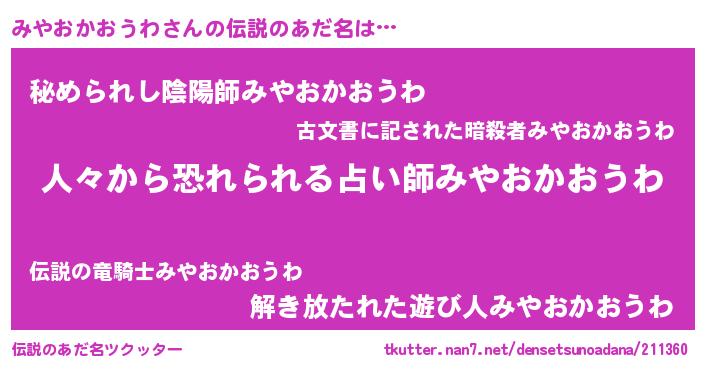 | 意味不明あだ名 | 『自称みやおかおうわ』 |