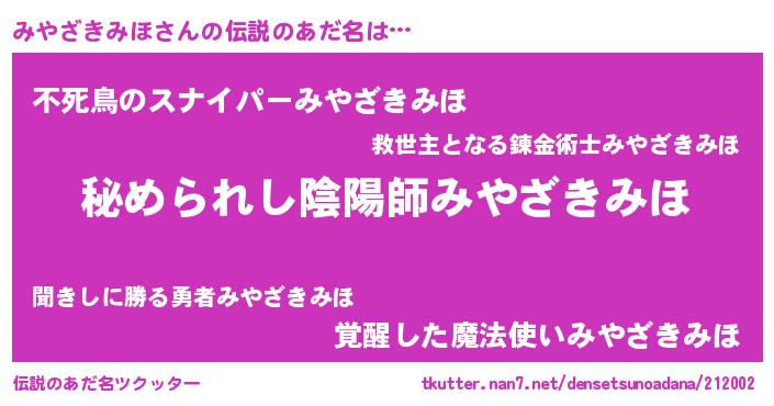 | 男性向けラノベタイトル風あだ名 | 『ミヤザキミホスレイヤー』 |