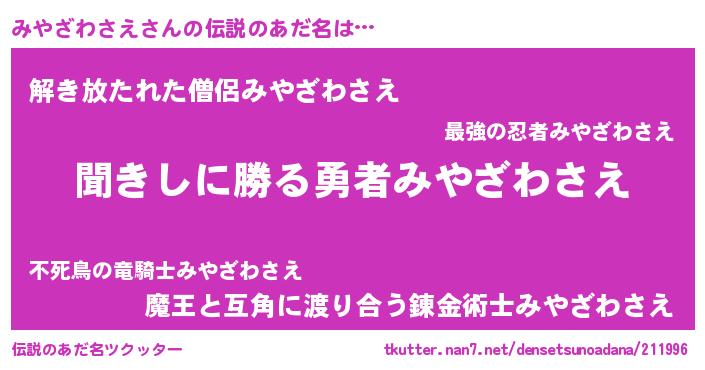 | 男性向けラノベタイトル風あだ名 | 『みやざわさえという概念が存在しない退屈な世界 』 |