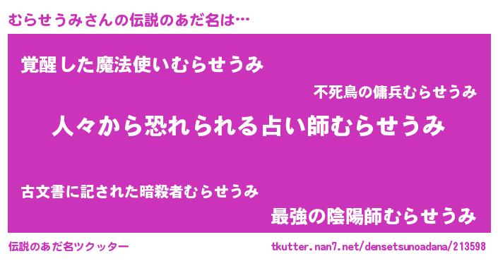 | ヒーロー風カッコイイあだ名 | 『正義の使者むらせうみ』『炎刃騎士ムラ』 |
