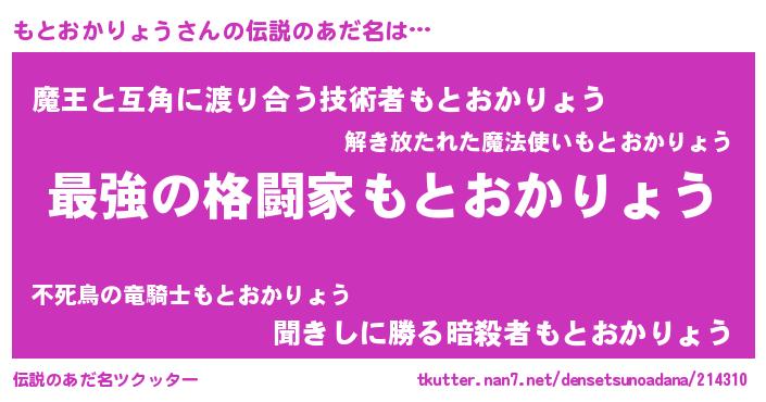 | 男性向けラノベタイトル風あだ名 | 『うちの娘の為ならば、俺はもしかしたらもとおかりょうも倒せるかもしれない。』 |