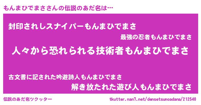 | 男性向けラノベタイトル風あだ名 | 『おまえをオタクにしてやるから、俺をもんまひでまさにしてくれ! 』 |