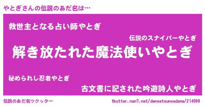 | 胡散臭い通販商品みたいなあだ名 | 『世界中を虜にした100年もののヴィンテージワイン…その名も「やとぎ」』 |