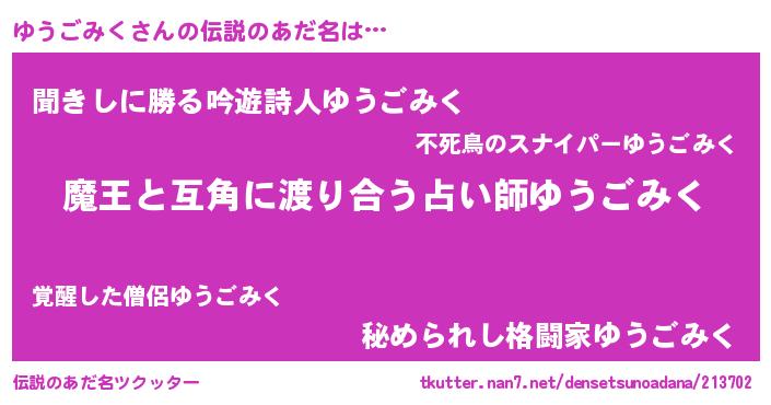 | ポケモン風あだ名 | 『ユウゴンZ』『ユックウザ』 |