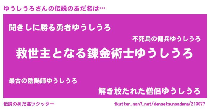 | ヒーロー風カッコイイあだ名 | 『天空の使者ゆうしうろ』『魔戒騎士ユウ』 |