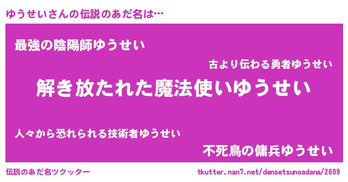 | ヒーロー風カッコイイあだ名 | 『サイバー戦士ユウセイ』『天弓騎士ユウ』 |