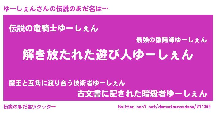 | 男性向けラノベタイトル風あだ名 | 『ダンジョンにゆーしぇんを求めるのは間違っているだろうか』 |