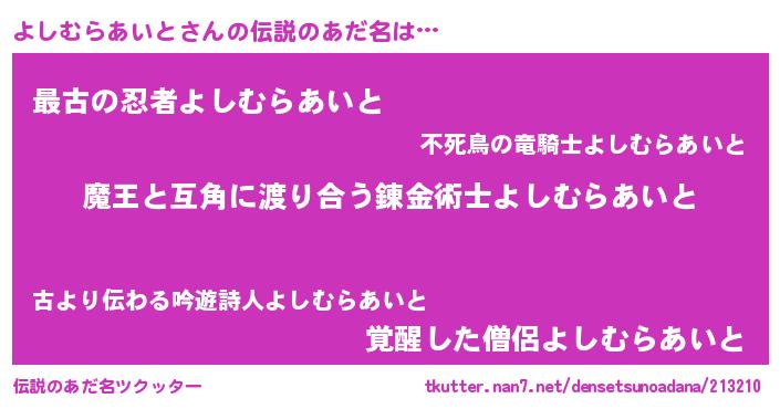 | 男性向けラノベタイトル風あだ名 | 『ノーゲーム・ノーヨシムラアイト』 |