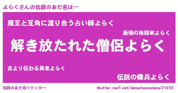 | 意味不明あだ名 | 『とにかく怪しいよらく』『自称よらく』 |