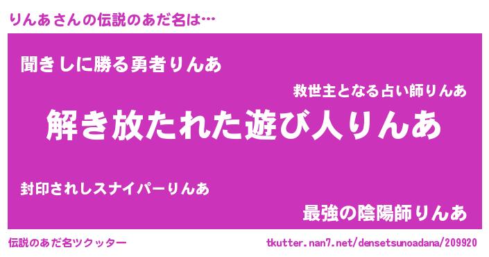 | 男性向けラノベタイトル風あだ名 | 『りんあの嫁は女の子じゃないと思った?』 |