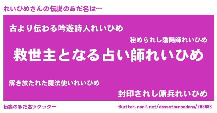 | ヒーロー風カッコイイあだ名 | 『慈愛の使者れいひめ』『ネオレイヒメ』 |