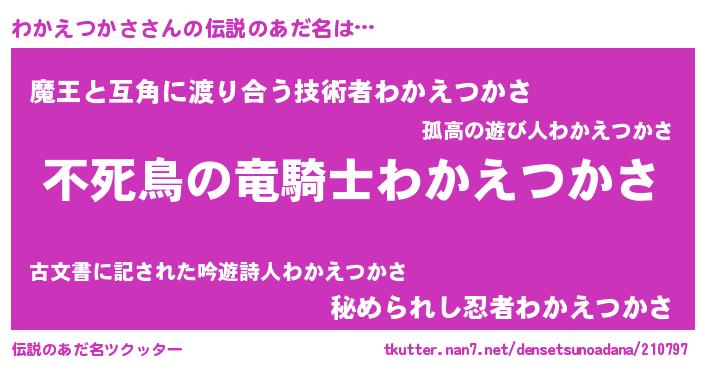 | 女子向けラノベタイトル風あだ名 | 『わかえつかさ姫と円卓の騎士』 |