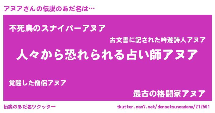 | ヒーロー風カッコイイあだ名 | 『正義の使者アヌア』『スーパーアヌア』 |