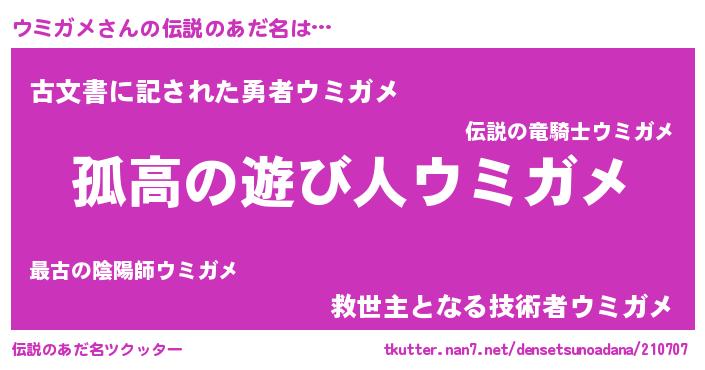 | ヒーロー風カッコイイあだ名 | 『黄金騎士ウミ』『ネオウミガメ』 |
