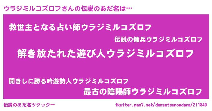 | 意味不明あだ名 | 『住所不定無職ウラジミルコズロフ(93歳)』 |