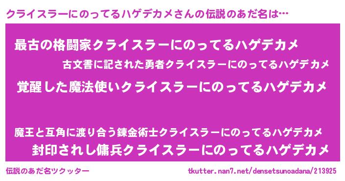 | 胡散臭い通販商品みたいなあだ名 | 『全米が絶賛したサプリメント…その名も「クライスラーにのってるハゲデカメ」』 |