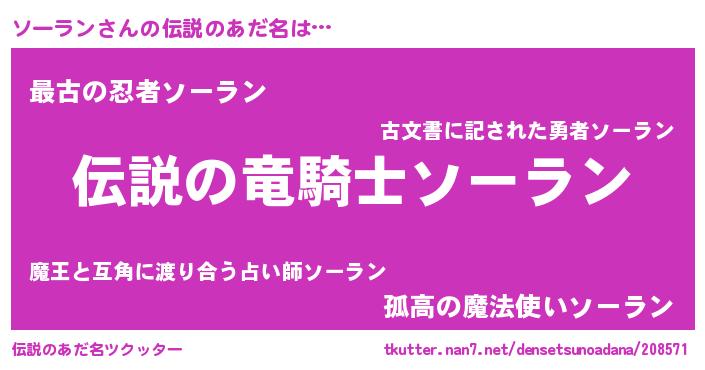 | 男性向けラノベタイトル風あだ名 | 『ソーランの憂鬱』『魔弾の王とソーラン』 |