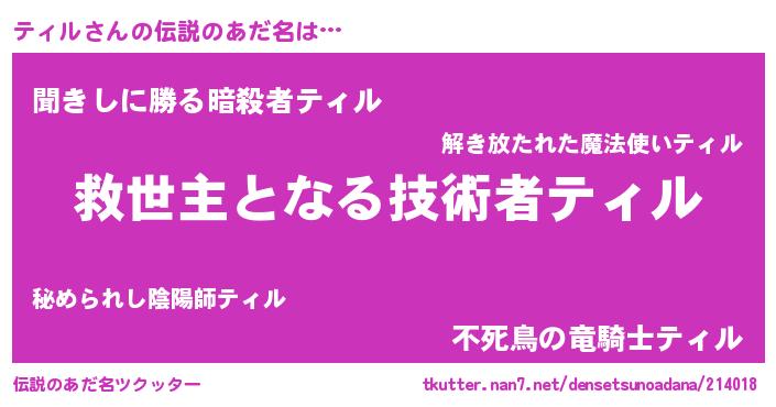 | ヒーロー風カッコイイあだ名 | 『慈愛の使者ティル』『ネオティル』 |