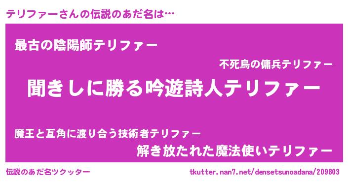 | 男性向けラノベタイトル風あだ名 | 『テリファーという概念が存在しない退屈な世界 』 |