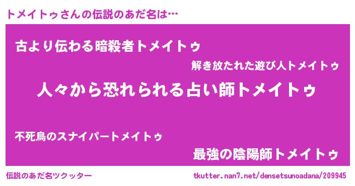| ヒーロー風カッコイイあだ名 | 『正義の使者トメイトゥ』『仮面トメダー』 |