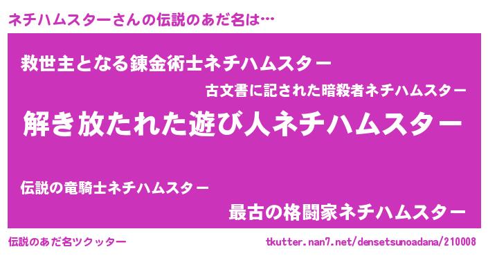 | 女子向けラノベタイトル風あだ名 | 『乙女ゲームの破滅フラグしかない悪役ネチハムスターに転生してしまった…』 |