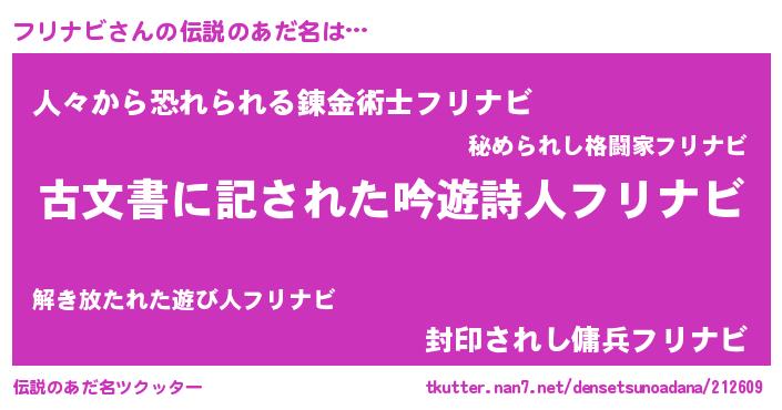 | 意味不明あだ名 | 『永久保存フリナビ』『自称フリナビ』 |