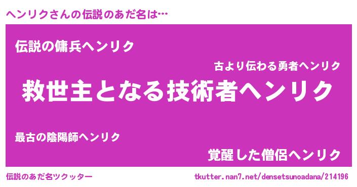 | ヒーロー風カッコイイあだ名 | 『天空の使者ヘンリク』『天弓騎士ヘン』 |