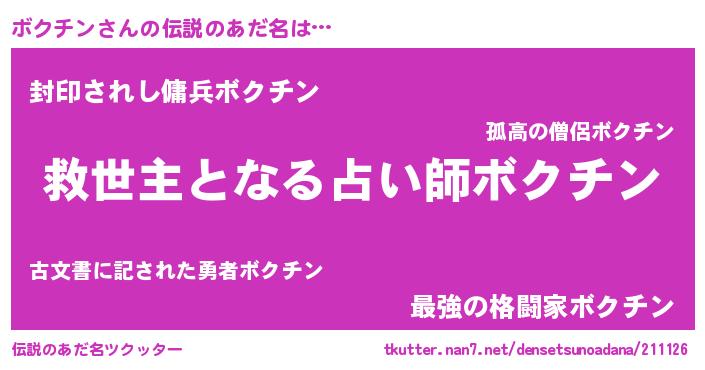 | 男性向けラノベタイトル風あだ名 | 『ボクチンに滅ぼされるだけの簡単なお仕事です』 |