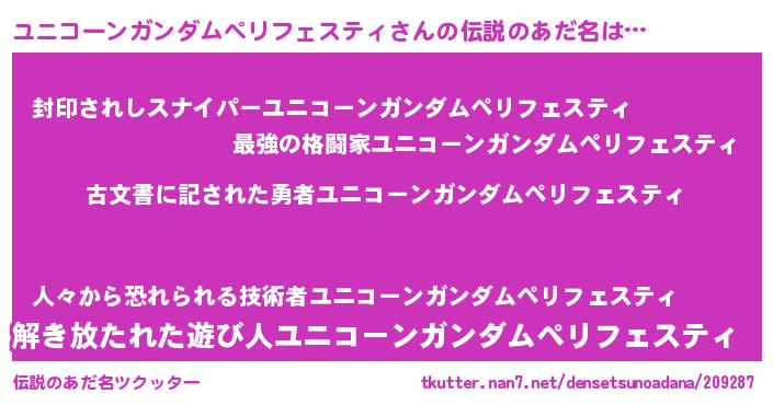| 意味不明あだ名 | 『永久保存ユニコーンガンダムペリフェスティ』 |