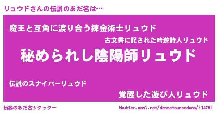 | ファンタジー風あだ名 | 『ゼリュトゥ』『エターナルリュウドー』 |