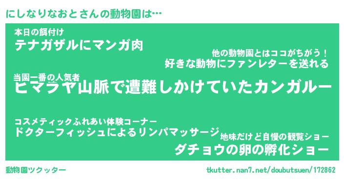 | ツイッター | にしなりなおとさんのツイッターID『namakemono_man』 |
