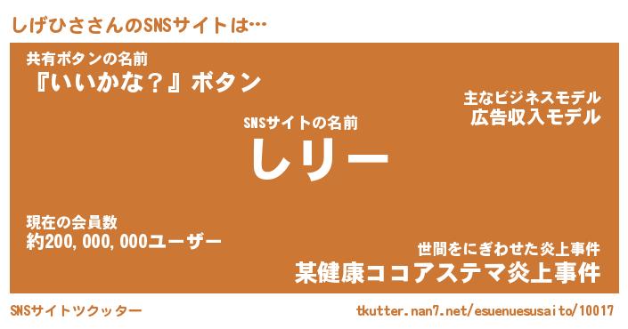 | 意味不明あだ名 | 『ペロリンしげひさ』『永久保存しげひさ』 |