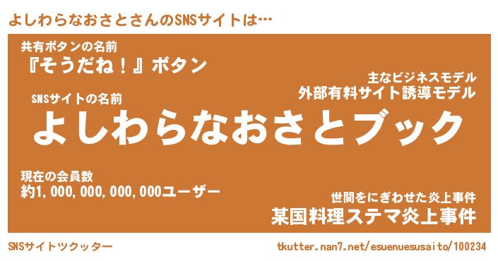 | 胡散臭い通販商品みたいなあだ名 | 『億万長者になれるブレスレット…その名も「よしわらなおさと」』 |